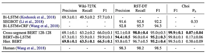 图 5:在 text segmentation 和 discourse segmentation 任务测试集的评估结果。Source: Text Segmentation by Cross Segment Attention.[6]