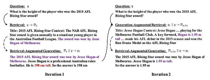 图 7:ITER-RETGEN 迭代地进行检索和生成。在每一次迭代中,ITER-RETGEN 都会利用前一次迭代的模型输出作为上下文,帮助检索更多相关的知识,这种方法有助于改进模型生成的响应(如本图中更正 Hesse Hogan 的身高案例)。为了简洁起见,本图中仅显示了两次迭代过程。实线箭头连接 query 和检索到的知识,虚线箭头表示检索增强生成流程。Source: Enhancing Retrieval-Augmented Large Language Models with Iterative Retrieval-Generation Synergy[13].