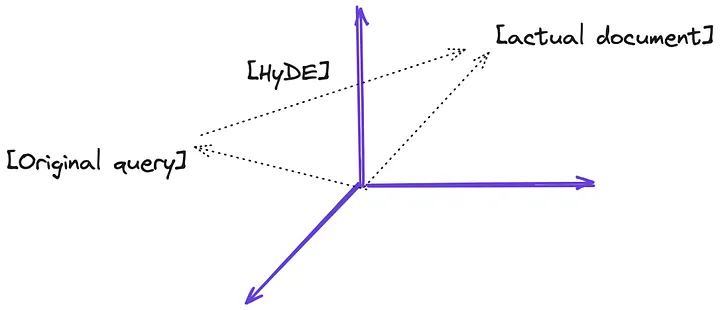图 3:根据我的理解,HyDE 的目标是生成 hypothetical documents 。这样,最终的查询向量 v 会尽可能地与向量空间中的实际文档接近、对齐。图片由原文作者提供。