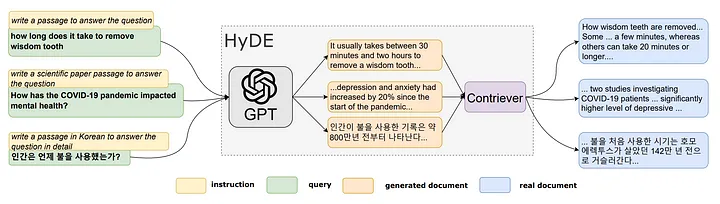 Hypothetical Document Embeddings,HyDE: 通过 hypothetical documents (并非实际存在的文档,而是虚构文档,用于对齐 queries 和系统中存储的文档的语义空间。)对齐 queries 和系统中存储的文档的语义空间。