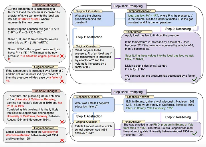 - Step-Back Prompting:引导 LLM 从具体问题中抽象出高层次概念,有助于模型正确推理。