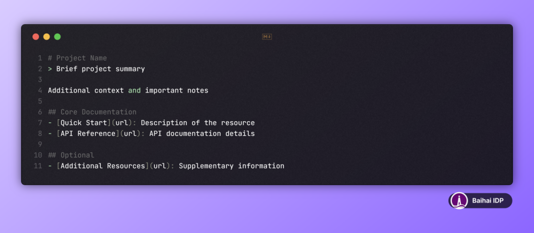 在这个文件中,开头需使用 H1 格式标注项目名称,并紧接着一个 blockquote 格式的摘要。文件的后续部分通过 H2 标题来整理文档链接。还有一个“Optional”部分,专门用来标注那些相对不那么重要的资源。