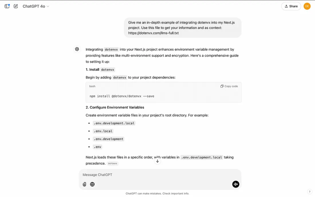 在 ChatGPT 中使用 llms-full.txt 文件的截图(图片由作者提供)