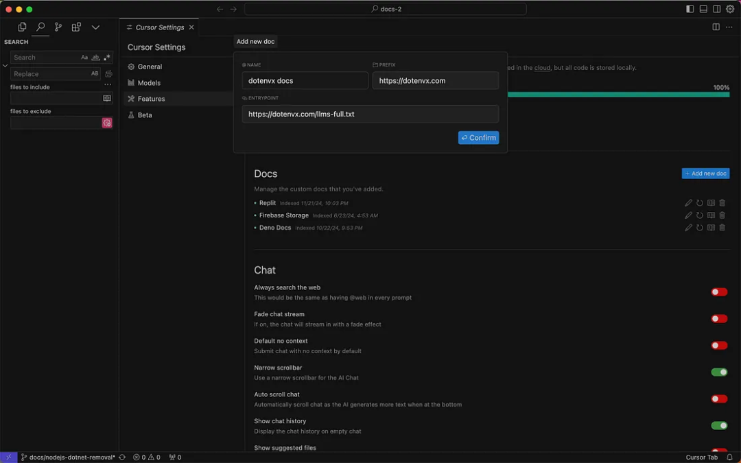 Cursor 可以让我们添加并索引外部文档,这样就能在对话中引用这些内容。操作方法很简单,只需输入 @Docs > Add new doc。随后会出现一个弹窗,我们可以在那里粘贴 /llms-full.txt 文件的链接。之后,就能像使用其他文档一样,将其作为对话的上下文。