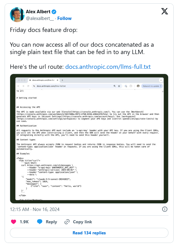 Anthropic 公司 Claude Relations 部门的负责人 Alex Albert,在 X 上宣布了对 LLMs.txt 的支持