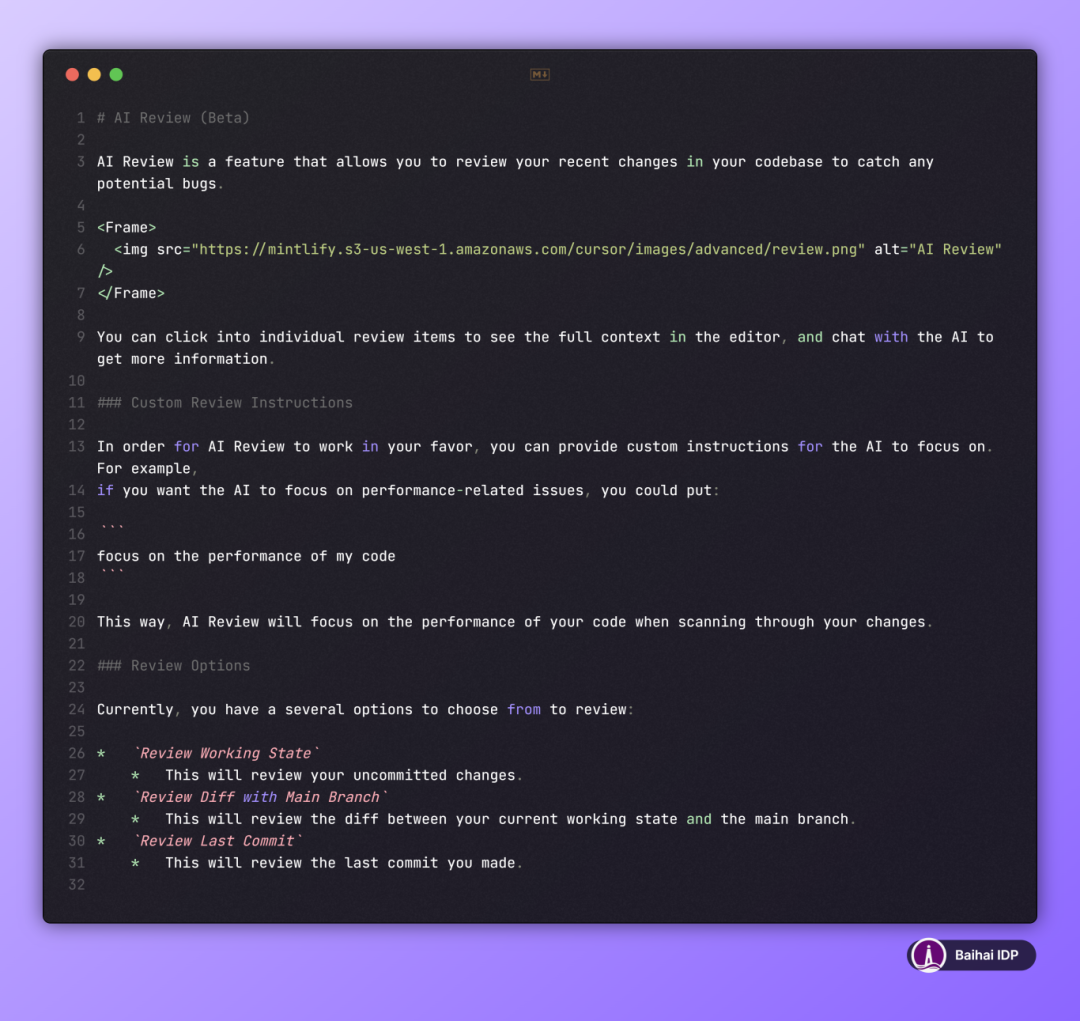 上图的内容摘录是来自于 Cursor 的 /llms-full.txt 文件。如需查看完整文件,请访问 Cursor 的官方文档页面。