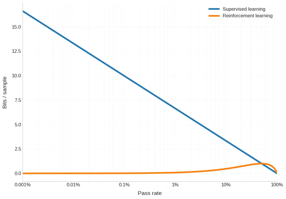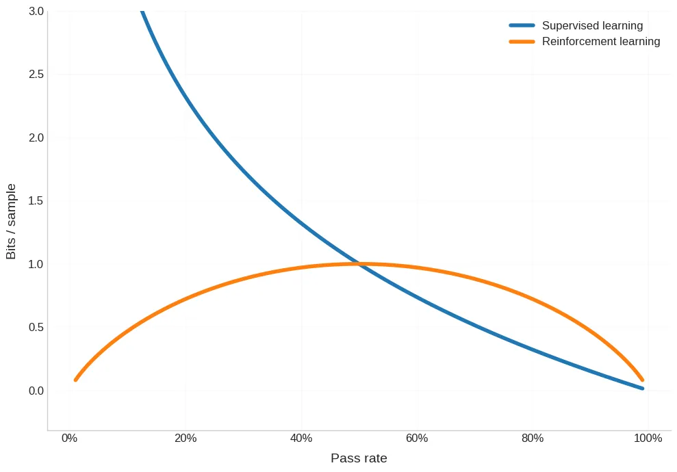 而在强化学习中,你只会被告知答案是否正确。你能从中提取的信息量,受限于你对这个二元结果(对/错)的不确定性。如果你几乎总是通过(p ≈ 1)或几乎总是失败(p ≈ 0),那么每次试验都很难让你感到意外。 当通过的概率像抛硬币一样时(p ≈ 0.5),你学到的东西最多。 对于一个二元随机变量,其信息量的上限由熵公式给出:在 RL 中,你从每个样本中最多能学到 Entropy(p) = -p log(p) - (1-p) log(1-p)1 bits 的信息。