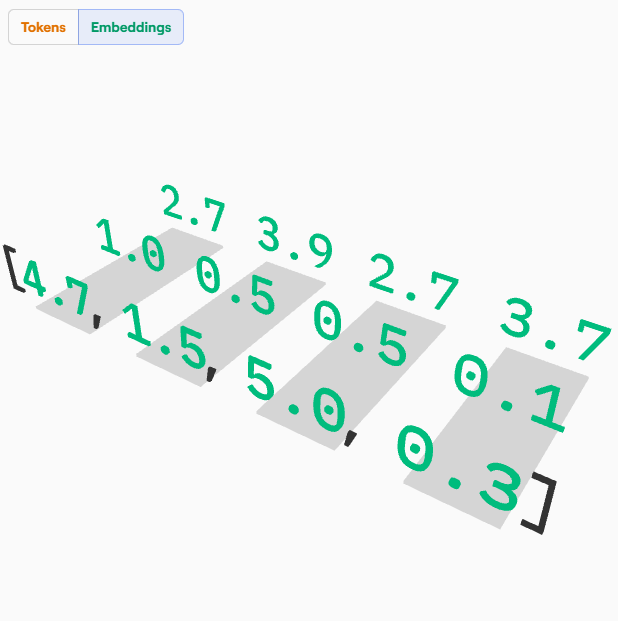于是,我们把 tokens(整数数组)转换成了 embeddings(数组的数组,即“矩阵”)。