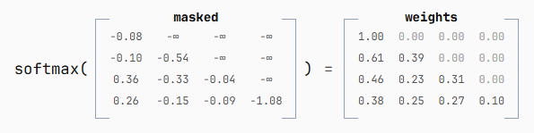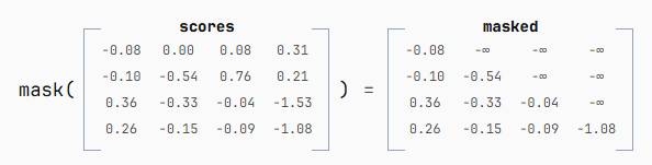 为了解决这个问题,我们对矩阵应用一个三角形掩码(triangular mask),将未来 token 对应的位置置零。不过,我们并不是真的设为 0,而是设为负无穷(negative infinity) —— 原因稍后解释。