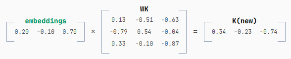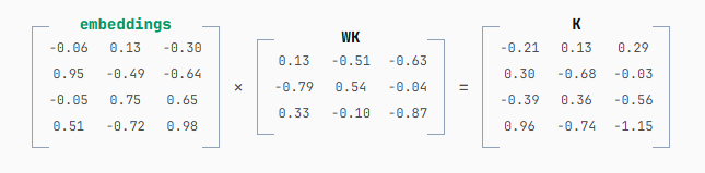 要得到 Q 和 K,我们分别将 embeddings 与 WQ 和 WK 相乘。WQ 和 WK 的行数和列数始终等于 embedding 的维度(本例中为 3)。这里我为 WQ 和 WK 选取了随机值,并将结果四舍五入到小数点后两位以便阅读。