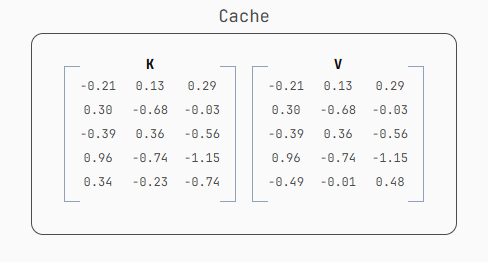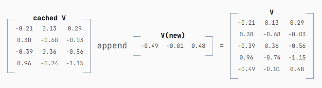 现在我们再次走一遍矩阵运算过程,但这一次:前 4 个 token 的 K 和 V 矩阵已被缓存,我们只传入一个新 token 的 embeddings。