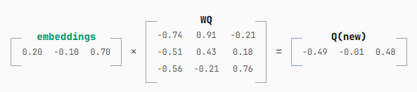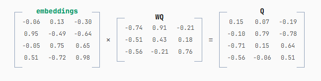 得到的 Q 矩阵有 4 行 3 列。4 行是因为 embeddings 矩阵有 4 行(每个 token 一行),3 列是因为 WQ 有 3 列(每个 embedding 维度一列)。
