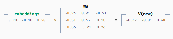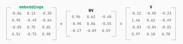 const V = embeddings * WV;// This is the `attentionWeights` function from// the section above. We're wrapping it in// this `attention` function. const weights = attentionWeights(embeddings);return weights * V;