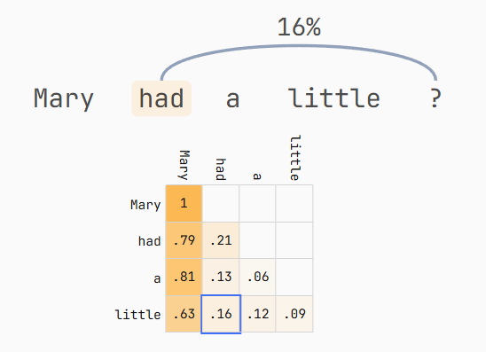 举个例子,如果 prompt 是 “Mary had a little”,被分词为四个 token:Mary、had、a、little,那么 attention 机制可能会决定,在生成下一个 token 时,模型会认为:
