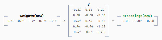 最后,我们将新的权重与新的 V 相乘,得到最终的新 embeddings:
