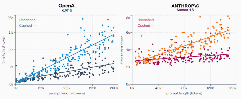 Anthropic 甚至声称[1],prompt caching 能将长 prompt 的延迟“最高降低 85%”。而在实际测试中,我发现对于足够长的 prompt,这一说法确实成立。我向 Anthropic 和 OpenAI 各发送了数百次请求,注意到在所有 input token 均被缓存的情况下,首 token 延迟(time-to-first-token latency)出现了明显下降。