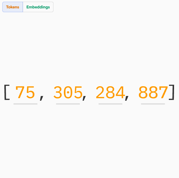 tokens [75, 305, 284, 887] 被转换为一个由 3 维 embeddings 构成的矩阵。
