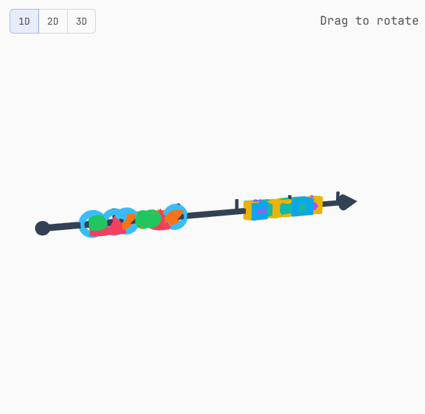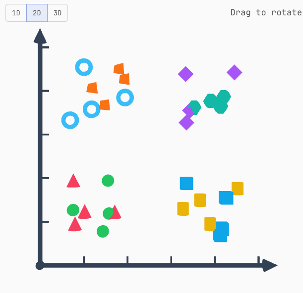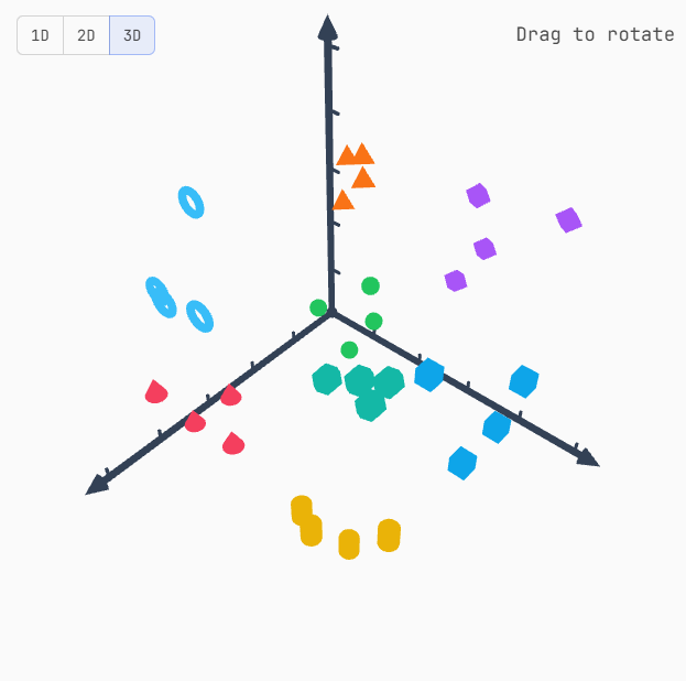 为了说明更高维度的价值,下面我展示了 8 组彩色形状,它们最初位于一维空间中 —— 挤在一条直线上,杂乱无章,难以理解。但随着维度增加,你就能清楚地看到存在 8 个不同的、相关的组别。