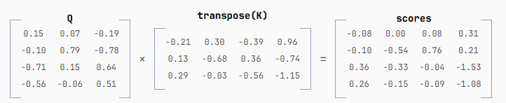 然后,我们将 Q 和 K 相乘。我们对 K 进行“转置”,也就是沿对角线翻转,使得得到的矩阵是一个方阵,其行数和列数都等于输入提示词中的 token 数量。
