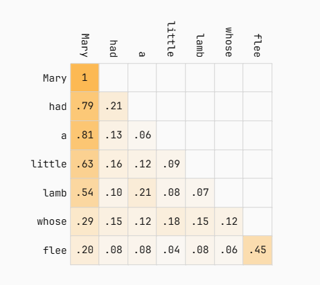 第一行只有"Mary",因此Mary对"had"的生成的贡献是100%。然后在第二行,"Mary"贡献了79%,而"had"贡献了21%用于生成"a",以此类推。LLM 认为这个句子中最重要的词是 “Mary”,这一点并不意外——从每一行中 “Mary” 都拥有最高权重就能看出。如果我让你补全"Jessica had a little"这个句子,你不太可能选择"lamb"。