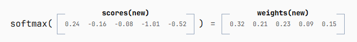 第二个问题是,这些 scores 是任意的数值。如果它们能变成一个每行之和等于 1 的概率分布,对我们来说会更有用。这正是 softmax 函数的作用。softmax 具体如何运作的细节并不重要 —— 它比简单的“将每个数字除以该行总和”稍复杂一点,但结果是一样的:每行之和为 1,且每个数字都在 0 和 1 之间。