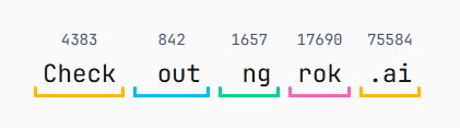 该 prompt 已被拆分为数组 [“Check”, " out", " ng", “rok”, “.ai”],并转换为 tokens [4383, 842, 1657, 17690, 75584]。相同的 prompt 始终生成相同的 tokens。tokens 也是区分大小写的 —— 因为大小写能传递语义信息。例如,首字母大写的 "Will" 更可能是人名,而小写的 "will" 则更可能是助动词。