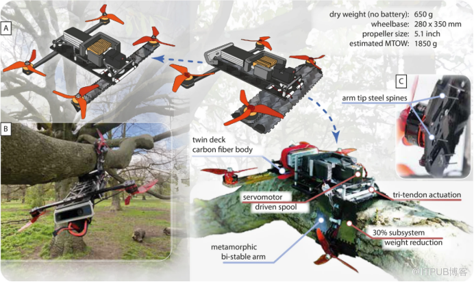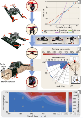 图1:变形栖息四旋翼机器人。( A ) 栖息任务循环与机器人在锁定、解锁和栖息状态下的图纸。( B ) 原型机器人倒挂在一棵英国橡树上的照片。( C ) 嵌入的钢刺横跨扁平解锁臂。
