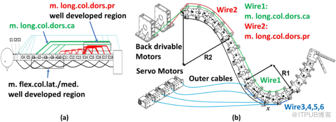 图2 RobOstrich机械臂的电线配置 (a)鸵鸟颈部的长肌肉发达 (b)RobOstrich实现类似鸵鸟颈部的肌肉结构