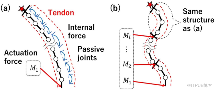 图1柔性机械臂的典型结构。(a)欠驱动系统(b)串行化的欠驱动系统