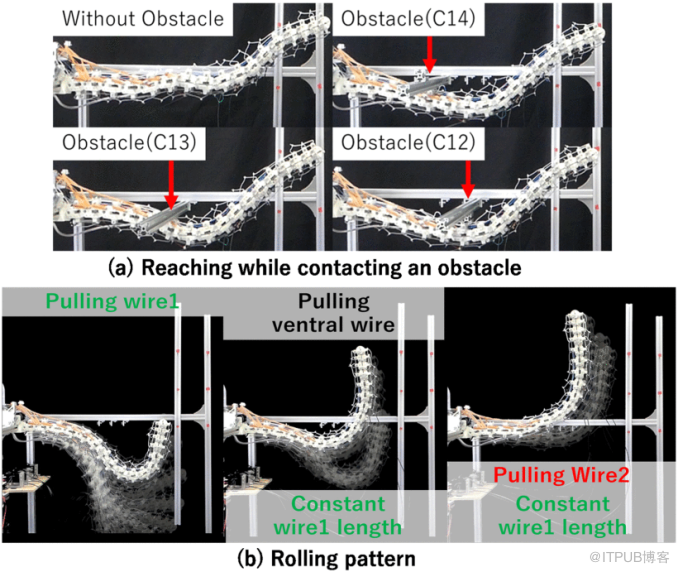 首先是障碍物到达任务,如图(a)所示,机械臂尾部在y处固定,且由于有两个自由度,可以实现:通过线1的牵引力进行的头部运动自由度和腹侧结构的自由度;由于机械臂的变形能力,即使接触障碍物时,头侧也可以移动,此外高自由度还能以更高精度调整链接长度。