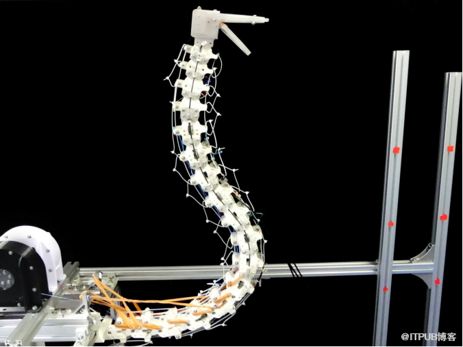 研究团队通过尼龙系带实现关节角度限制;在背侧使用陶瓷衬套以减少与电线的摩擦,并在两侧放置了五束钢琴线束用来模拟鸵鸟椎骨(椎间肌)之间的生物肌肉,以减少驱动所需的能量;而橡皮筋则被用作机械臂底部的韧带以提供张力,并确保机械臂在动态运动期间的安全运行。