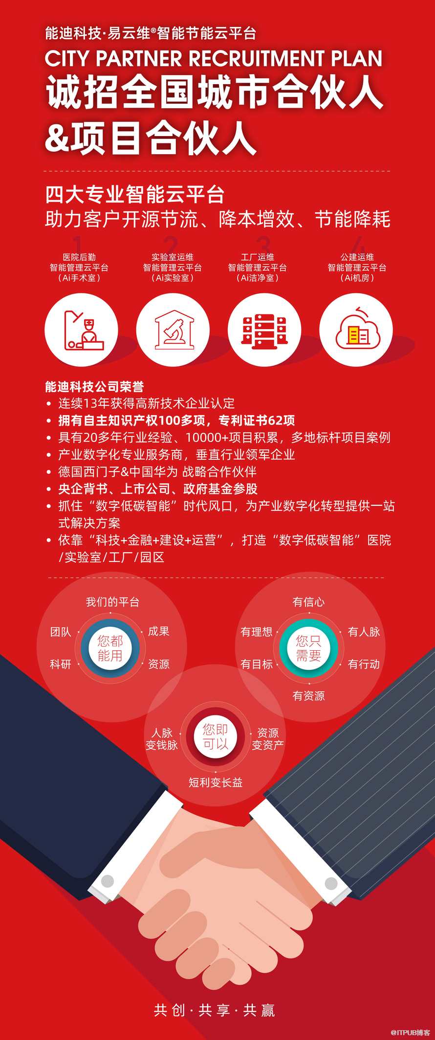 由于企业数字化转型是一项长期的系统工程,涉及对接、沟通、商务关系等各个方面, 能迪科技集团的易云维® 数字化工厂运维平台欲 招募广东省省会城市、地级市、县级市等,加强与各工业制造企业的信息共享,搭建沟通平台,并根据不同企业的特点,为其提供整体智能化的 解决方案;同时,我们将联合西门子、华为等知名品牌企业,搭建合作渠道,共同驱动制造业大企业数字化智能化转型。