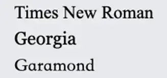 第一类,Serif[ˈserɪf]:有衬线字体,在每个字母的边缘都有一个小笔划。它们创造了一种正式和优雅的感觉。比如:Times New Roman[ˈrəʊmən],Georgia[ˈdʒɔːdʒə],Garamond 。(此时需要展示字体的样子)