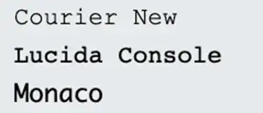 第三类,Monospace:单空格字体,这里所有的字母都有相同的固定宽度,因此又叫等宽字体,它们创造了一种机械的外观。一般我们在代码编辑器中会使用这些字体。比如 Courier New,Lucida Console,Monaco。