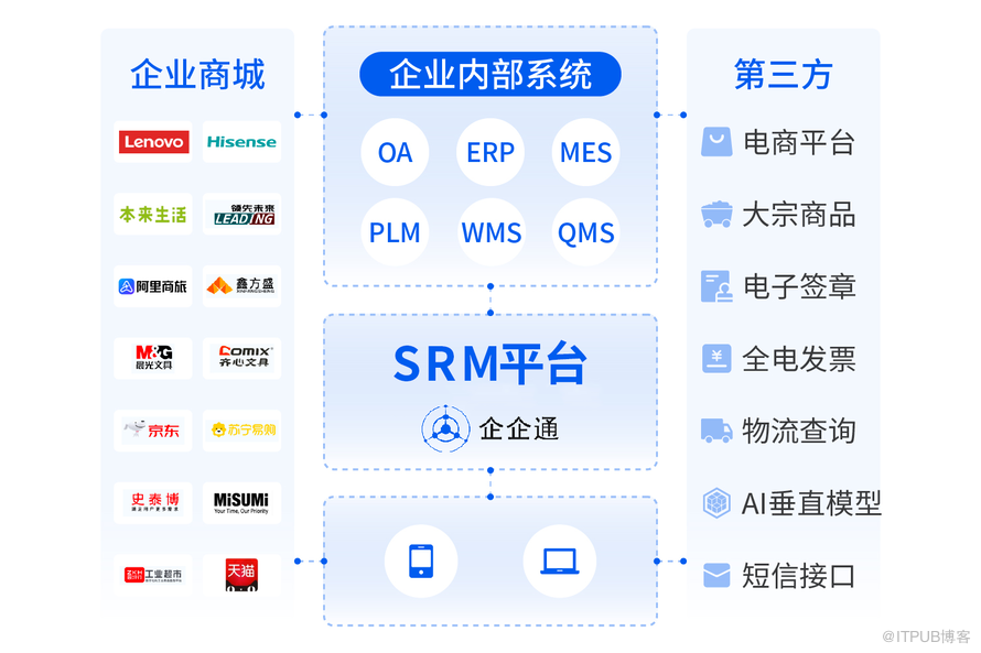 为促进供采交易与拓客销量增长,企企通企业商城对接了震坤行/晨光/史泰博等第三方主流电商平台,汇聚450万+商品资源,可满足企业一站寻源;该商城亦可支持对接ERP、OA、MES、WMS、财务等企业内部系统,信息与数据实时互通,实现供采双方业务协同更高效。