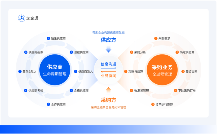 2、采购环节深度协同,规范化透明化采购: 实现订单-收货-入库-对账-开票-付款的全过程协同,采供双方按照可视化的规范流程对接需求,信息及时共享,降低沟通成本,推动采购全流程各节点的深度协同。