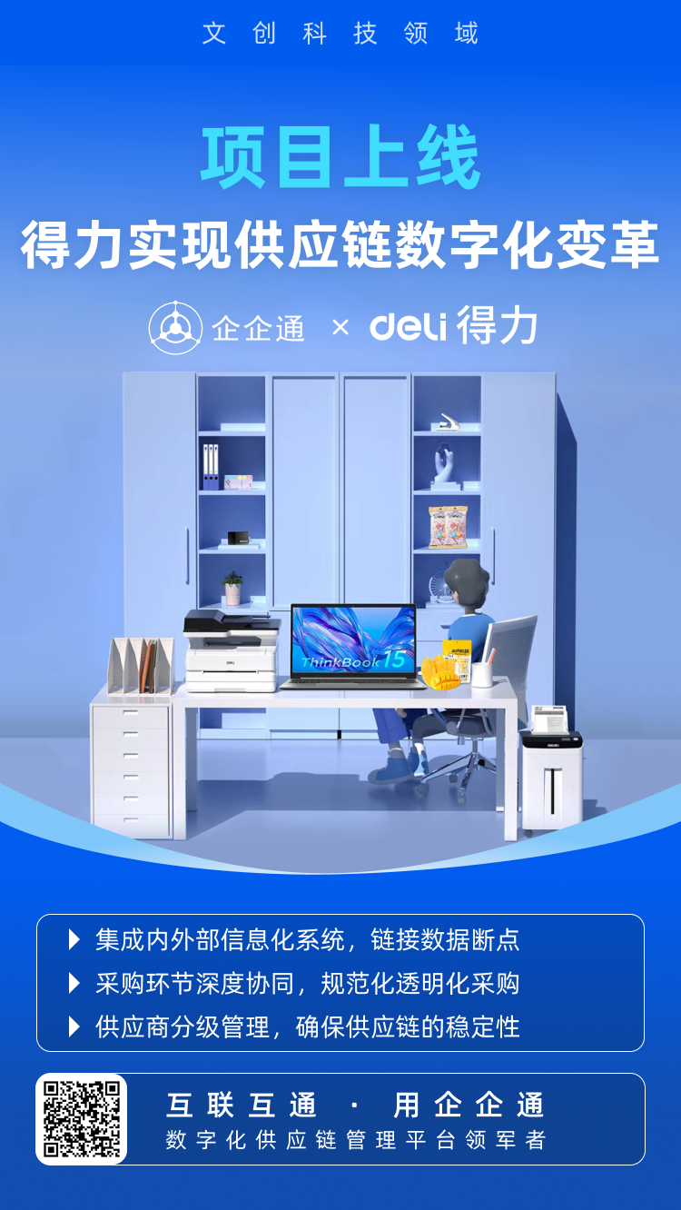 以此次平台上线为契机,企企通与得力集团将携手并进,在保障一期项目系统稳定运行的基础上,开展二期合作。双方将充分发挥各自优势资源,联合创新,共同探索数字化采购的新模式、新路径,为推动文创产业数字化转型升级贡献更多力量。