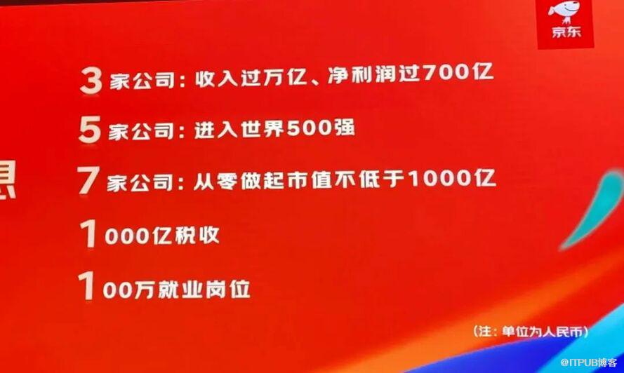 在题为《凝心聚力迈向“35711”梦想》全员信中,京东正式提出 “35711”梦想。“35711”,即能有3家年收入过万亿人民币,净利润过700亿人民币的公司;5家进入世界五百强的公司;7家从零做起市值不低于1000亿人民币的上市公司;能为国家缴纳1000亿人民币税收;提供超过100万就业岗位。