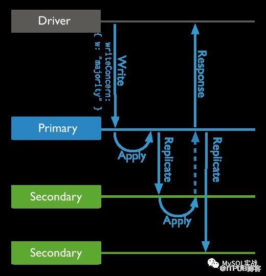 图中是一个一主两从的副本集,设置了w: "majority",代表一个写操作,需要等待副本集中绝大多数节点(本例中是两个)应用完,才会给客户端反馈。