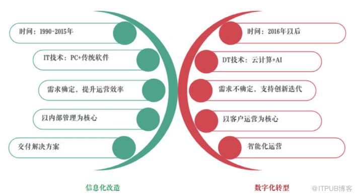 这张图简单明了的介绍了信息化改造与数字化转型的不同。因此,我特别能理解文章开头老王客户说的“我们要的是数字化转型方案,而不是信息化改造方案”!