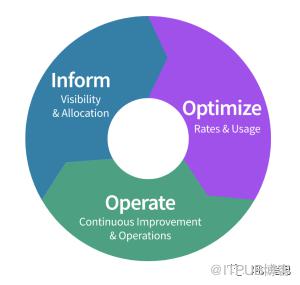 FinOps 基金会建议采用迭代方法来管理云服务的可变成本。最佳实践包括应持续管理的三个环节:通知、优化和运营。