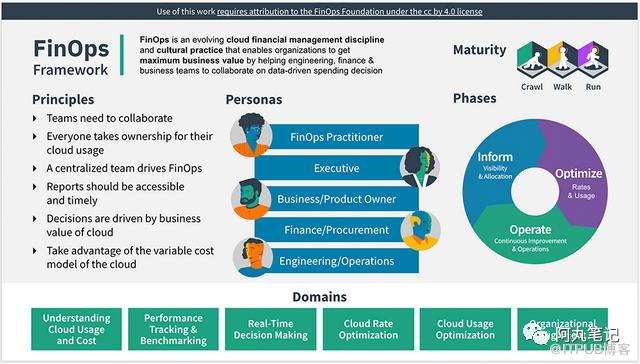 此外,FinOps还有几个非常重要的维度,包括六大原则、角色、循环方法论、成熟度模型。
