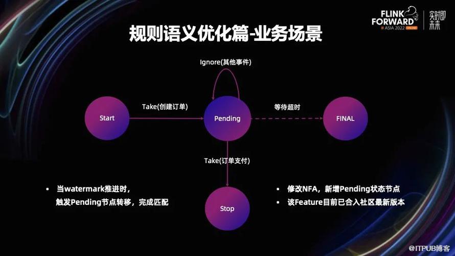 针对这个问题,我们在规则生成的 NFA 中引入一种 Pending 状态。当流入事件满足创建订单的条件之后,状态会随之迁移到 Pending 状态等待超时。当 Flink CEP 任务的 watermark 向前推进时,会触发 Pending 状态的 NFC 进行计算,判断是否已经超时,如果超时就会触发 NFA,迁移到下一个 Final 状态。如果在这之前系统流入了订单支付事件,就会转移到 Stop 状态。
