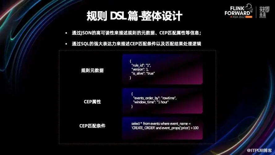 为了实现业务自主配置规则,规则的语法必须清晰易懂。我们设计规则 DSL 整体结合了 JSON 和基础 SQL 语法,利用 JSON 的高可读性来描述规则的元数据、规则匹配属性等信息,利用 SQL 的强大表达力来描述 CEP 匹配条件以及匹配结果的处理逻辑。