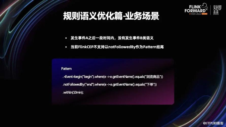 当发生事件 A 后一段时间内,没有发生事件 B,其对应的伪代码可能是上面的这种形式。当前的 Flink CEP 不支持这种语义,因为可能造成没有事件触发这条规则,最终完成匹配的情况。