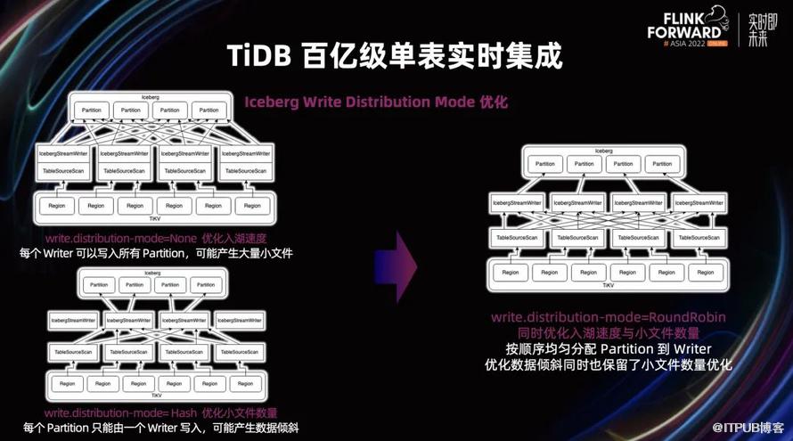 上图展示的是 write-distribution-mode 的优化,从上图可以看到集成作业的逻辑非常简单,作业通过 TableSourceScan 从 TIDB 读数据,再通过 IcebergStreamWriter 往 Iceberg 里写数据。TableSourceScan 在读到数据之后,怎么把数据发送给 IcebergStreamWriter 呢?这里就是 Iceberg 的 write-distribution-mode 的配置。