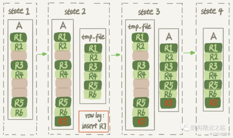 2、用数据页中表A的记录生产B+树,存储到临时文件中;3、生产临时文件的过程中,将所有对A的操作记录在一个日志文件(row log)中,对应的是图中state2的状态;4、临时文件生成后,将日志文件中的操作应用到临时文件,得到一个逻辑数据上与表A相同的数据文件,对应的就是图中state3的状态;