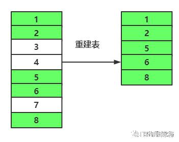 关于重建表,这时候新建一张结构一样的临时表,把表内的数据导入到临时表,直接删除旧表,然后将临时表替换为旧表,从而释放这些空余的空间,让数据变得"紧凑些",完成重建操作。alter table tableName engine=innodb