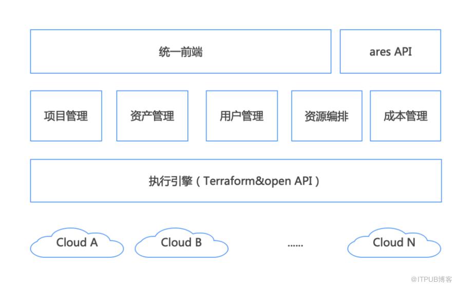 中间层为业务逻辑层,主要功能分为项目管理、资产管理、用户管理、资源编排和成本管理,涵盖云资源的增删改查等操作以及生命周期的管理,同时也管理了多云的账单以及云上的用户账号;