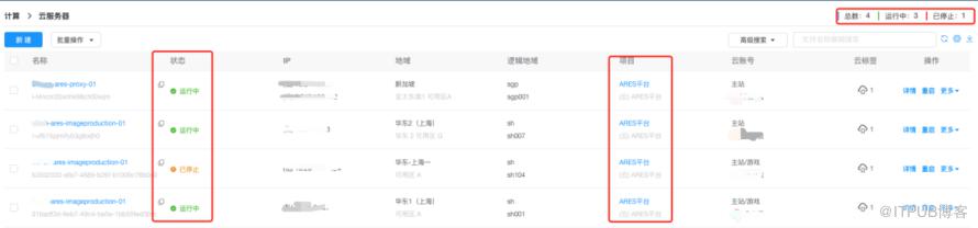 以公有云服务器的『状态』属性为例,不同公有云的取值范围不同,ARES的方案是,按照表示的含义取交集,对于交集没有包括的部分设置两种状态:异常状态和其它状态,所以标准化后的云服务器的状态为:创建中、运行中、启动中、停止中、已停止、异常、其它。用户可以通过筛选查看对应状态的资源。